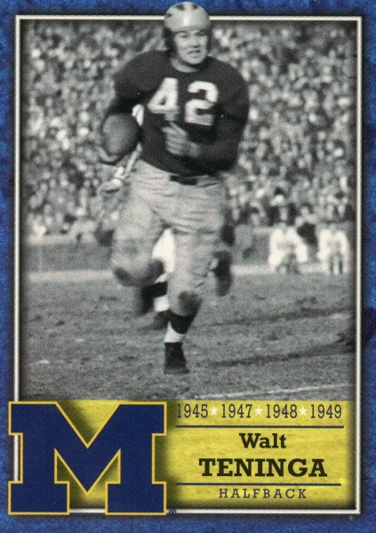 Walt Teninga played a vital role in Michigan's football dominance during the 1940s, contributing to back-to-back national championships in 1947 and 1948. As a halfback under Fritz Crisler and later Bennie Oosterbaan, Teninga's versatility and football acumen were crucial to the Wolverines' undefeated seasons, including the legendary ‘Mad Magicians’ team of 1947.